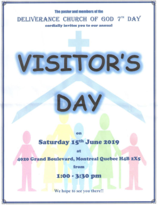 The Deliverance Church of God Seventh Day would like to invite all to our 6th Anniversary Service, which will be held on October 26th, 2019, from 1:00pm to 3:30pm at 4020 Grand Boulevard in Montreal.