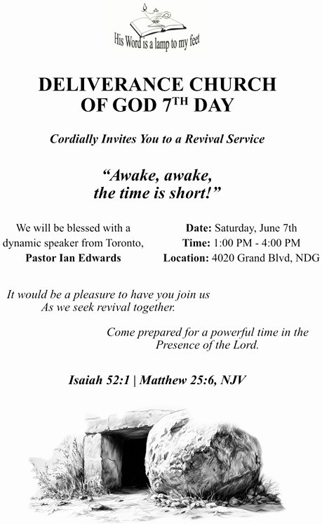 The Deliverance Church Of God 7th Day is inviting you all to a Revival Service (Theme: Awake, awake! The time is short. Scripture: Isaiah 52:1, Matthew 25:6.)